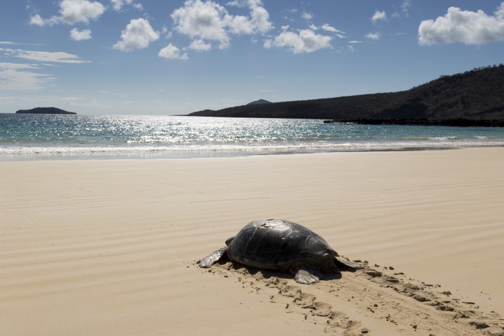Galapagos green turtle returns to the ocean, Floreana Island, Galapagos Archipelago, Ecuador