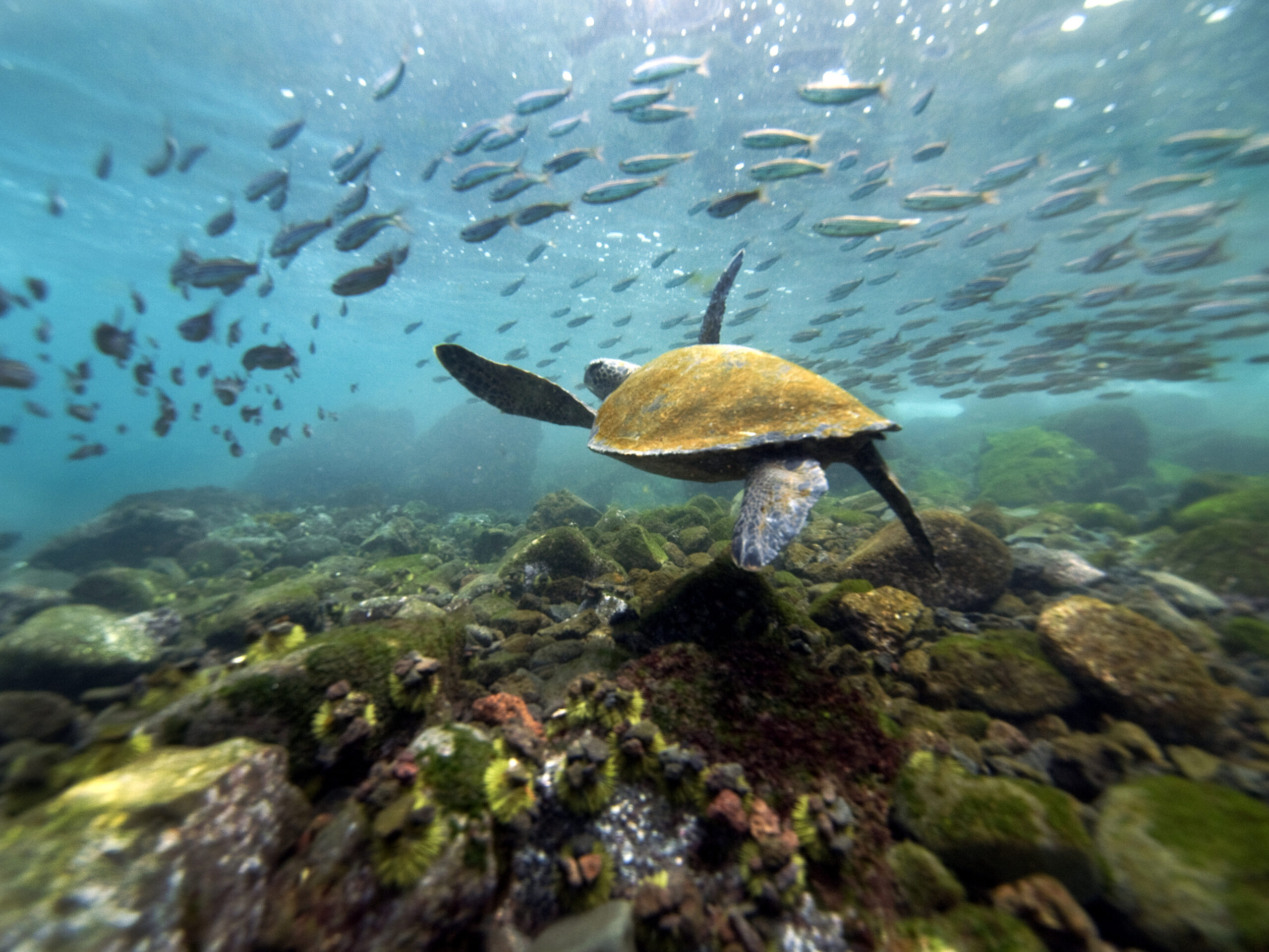 In the Galapagos Islands, off of Floreana Island a Galapagos sea turtle (Chelonia mydas agassisi) swims in Champion Islet