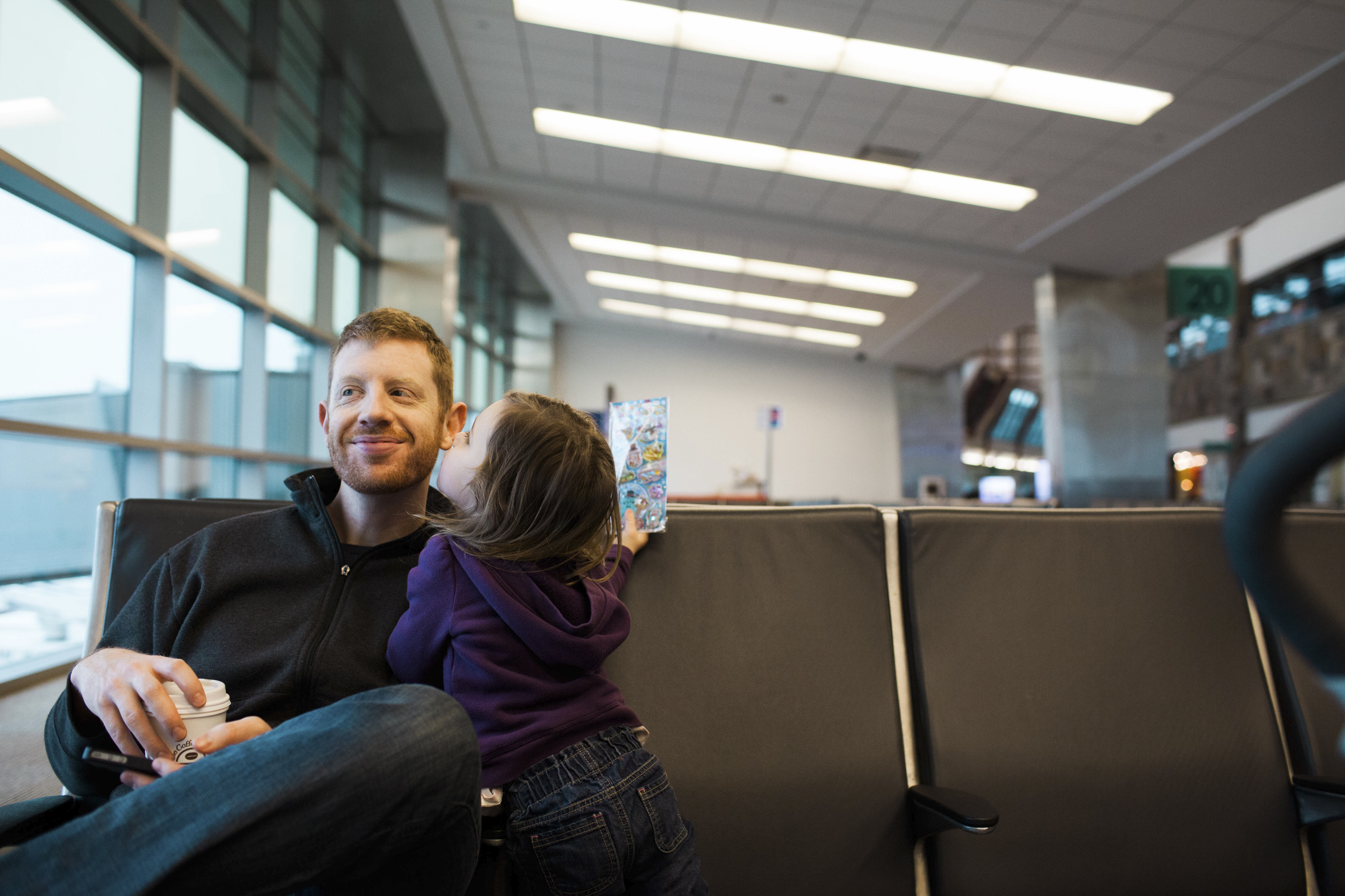 Girl giving dad a kiss waiting in airport