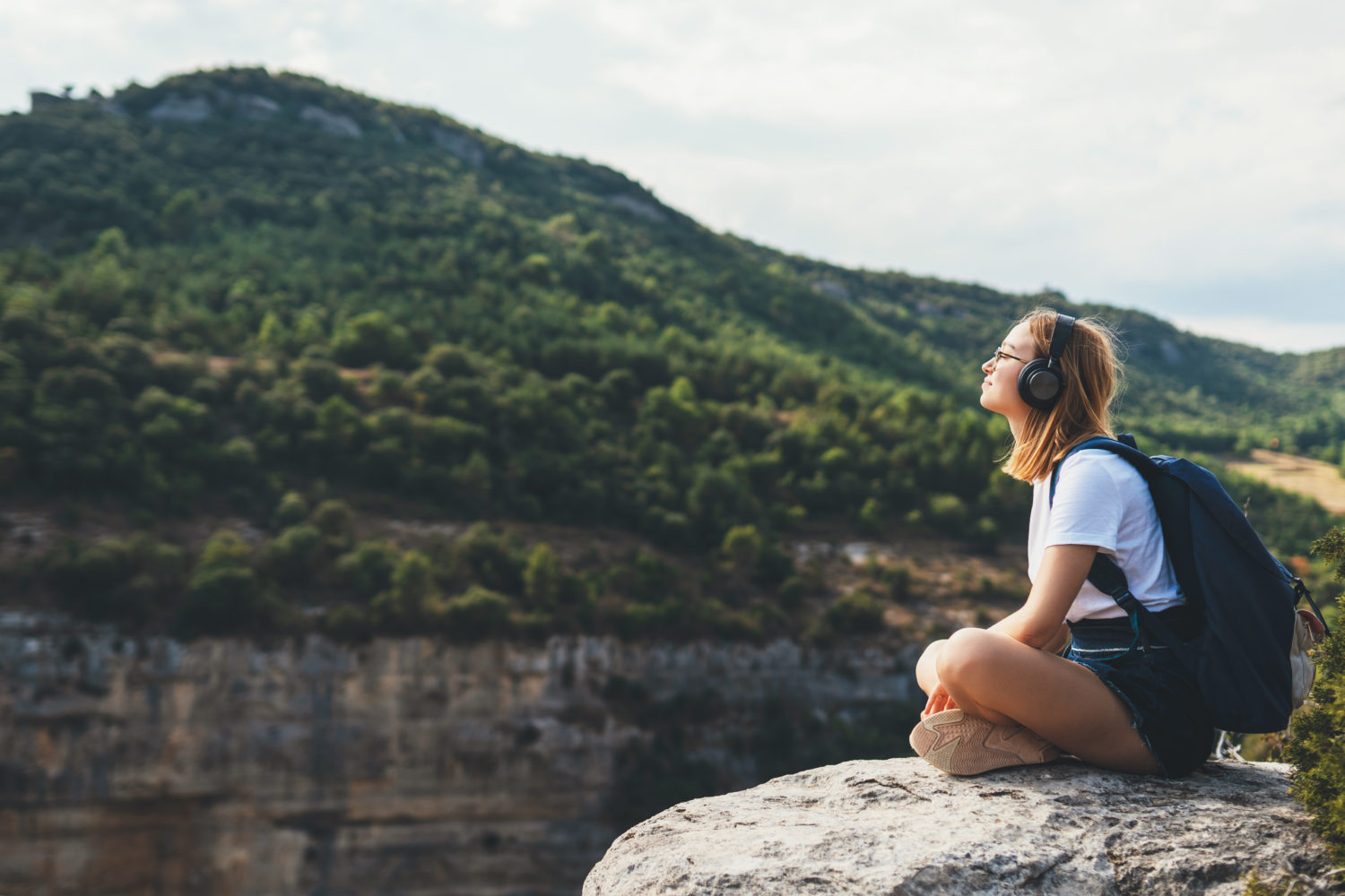 girl meditating on the top of a mountain, tourist woman with a backpack listening to music on headphones enjoy Hiking background panorama landscape on vacation outdoors, empty space