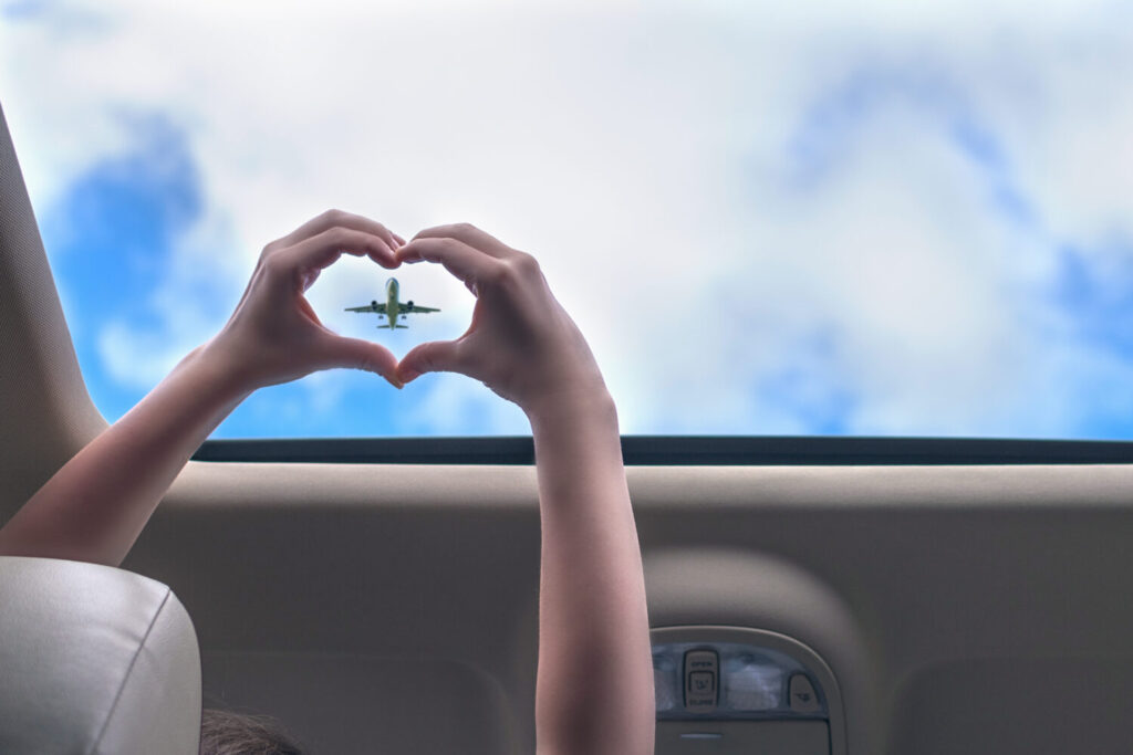 Girl shows her hands in a form of heart on the airplane in open hatch of a vehicle. Travel concept