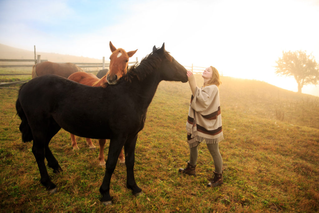 Girl with an horse playing together at the farm. Horses in an early morning foggy field. Concept people and animals. Woman in boho style.