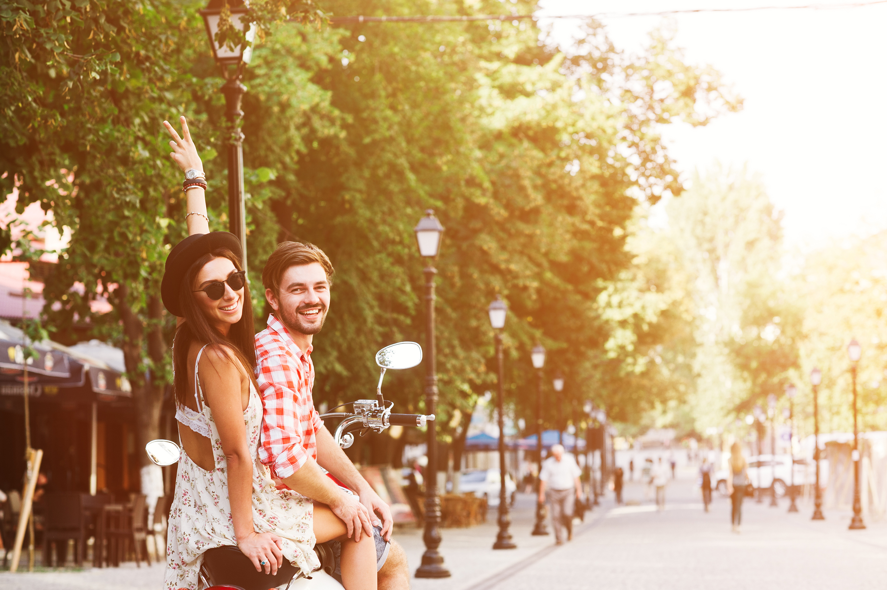 glamorosa y feliz pareja joven montada en una moto vintage en la calle, la mujer usa un sombrero y gafas de sol
