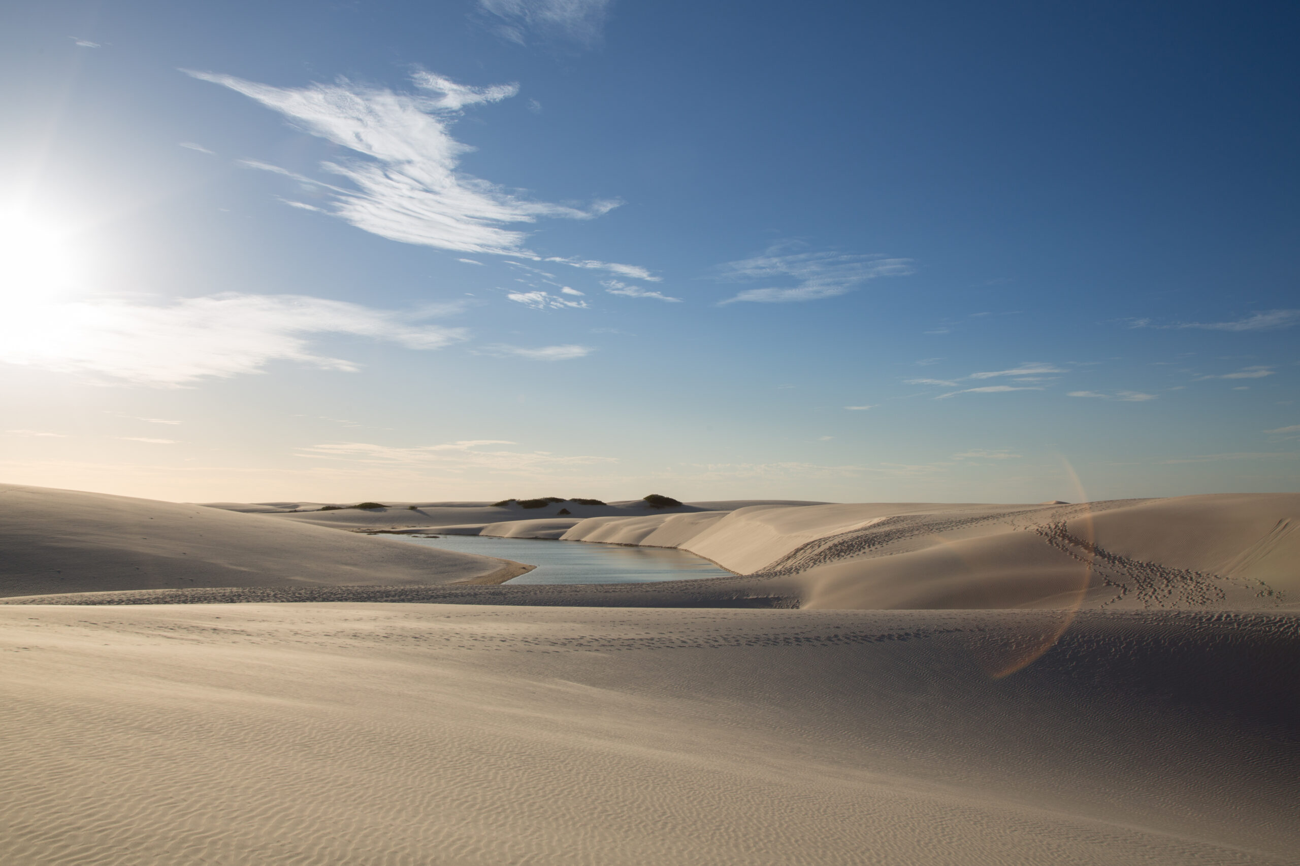 Golden dunes at the sunset of the lençois maranhenses with a photo flare. Maranhão, Brazil.