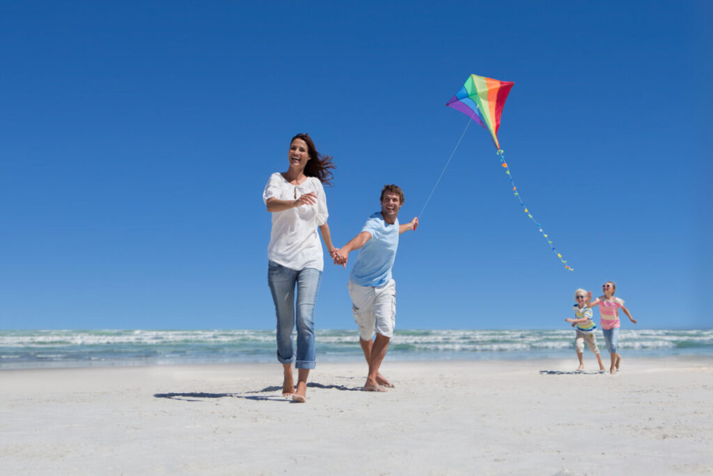 Gran foto de una pareja que volaba una cometa con sus hijos corriendo al fondo en una playa soleada.