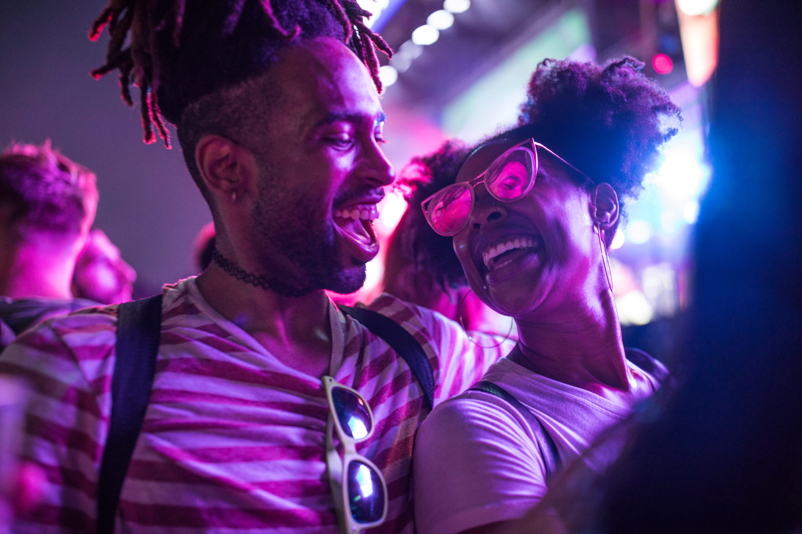 Multi ethnic group of friends having good time at summer festival, they drinking beer and enjoy in music. They ware casual clothing