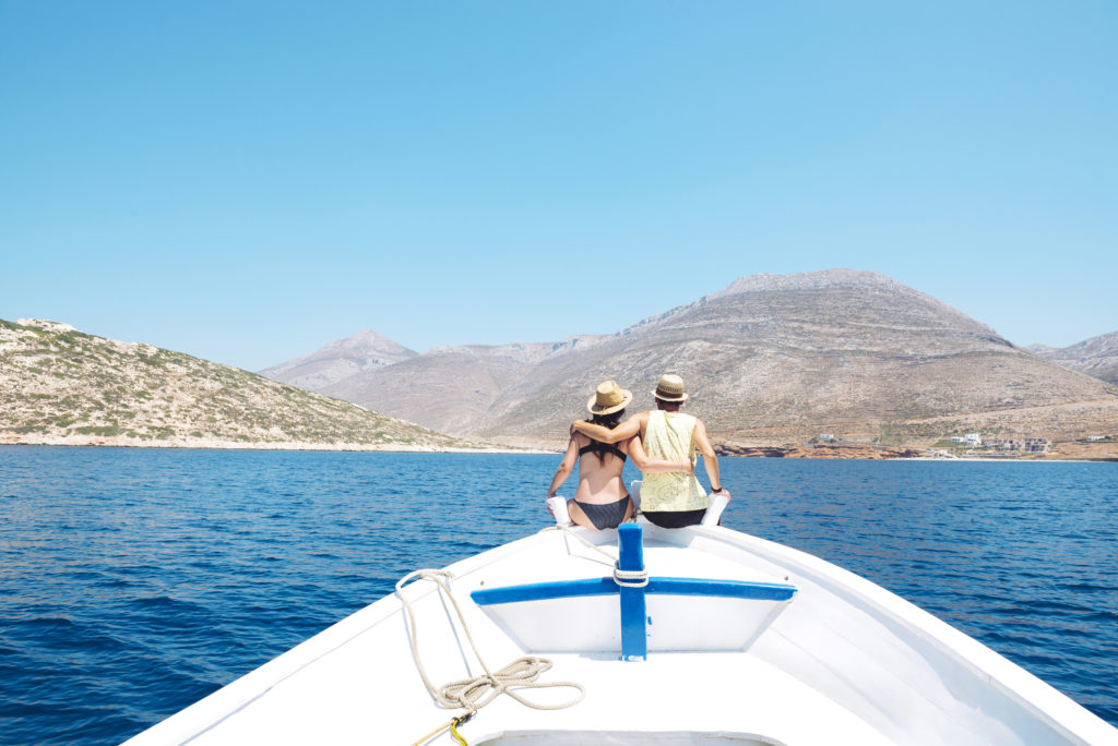 Greece, back view of couple sitting arm in arm on bow of a boat looking at Amorgos Island ID: 69769 -1