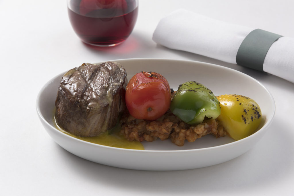 Grilled beef sirloin with Carapulcra stew and chargrilled baby sweet peppers