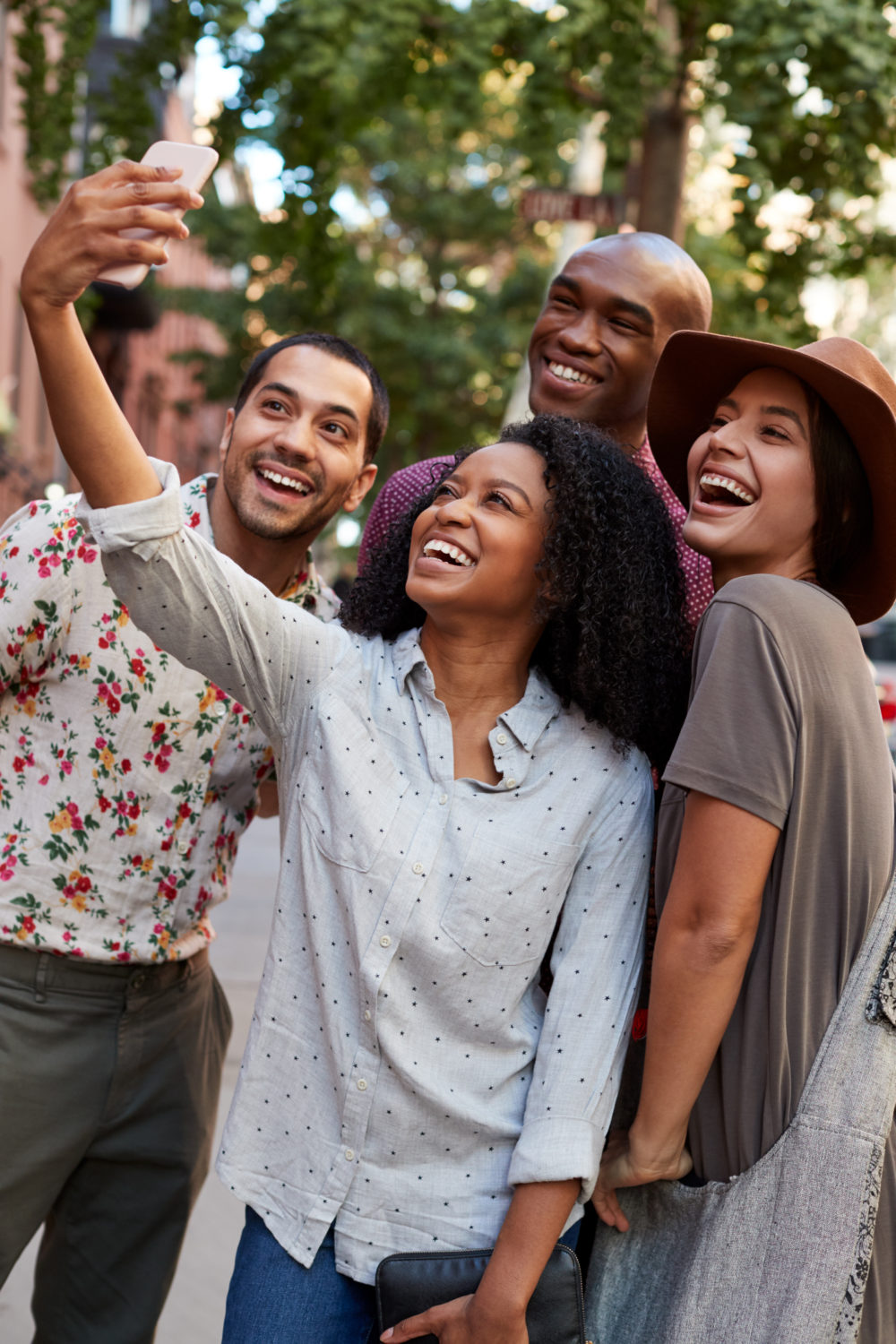 group of friends posing for selfie on street in new ID: 45626 Group Of Friends Posing For Selfie On Street In New York City
