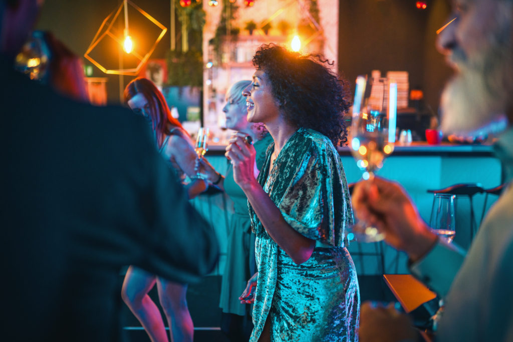 Business people having fung and dancing together at a business party. They are celebrating and toasting at a bar.
