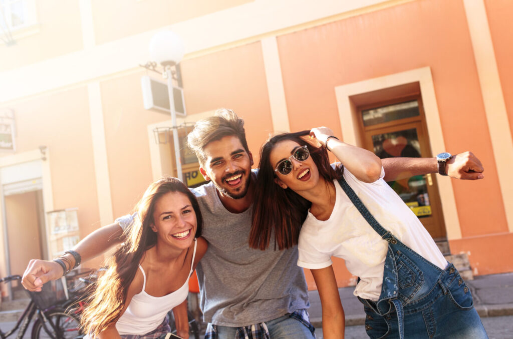 Grupo de jóvenes amigos felices divirtiéndose en la calle de la ciudad.