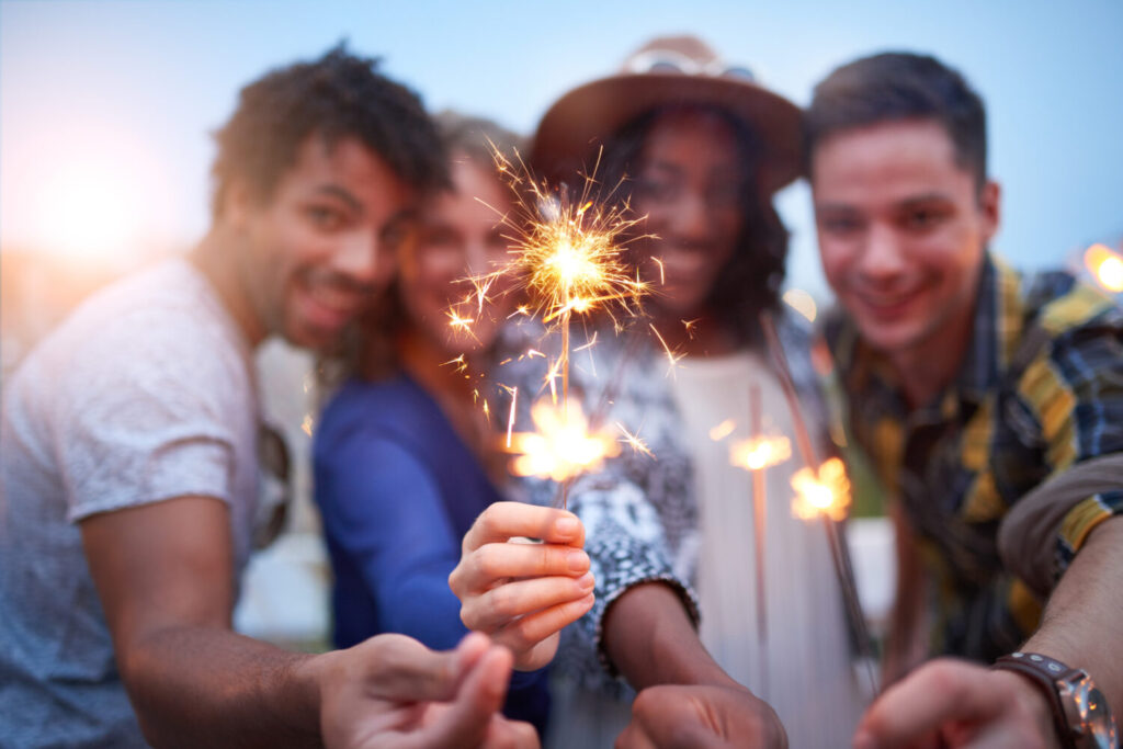 grupo multietnico milenario de amigos doblando chispas en la terraza