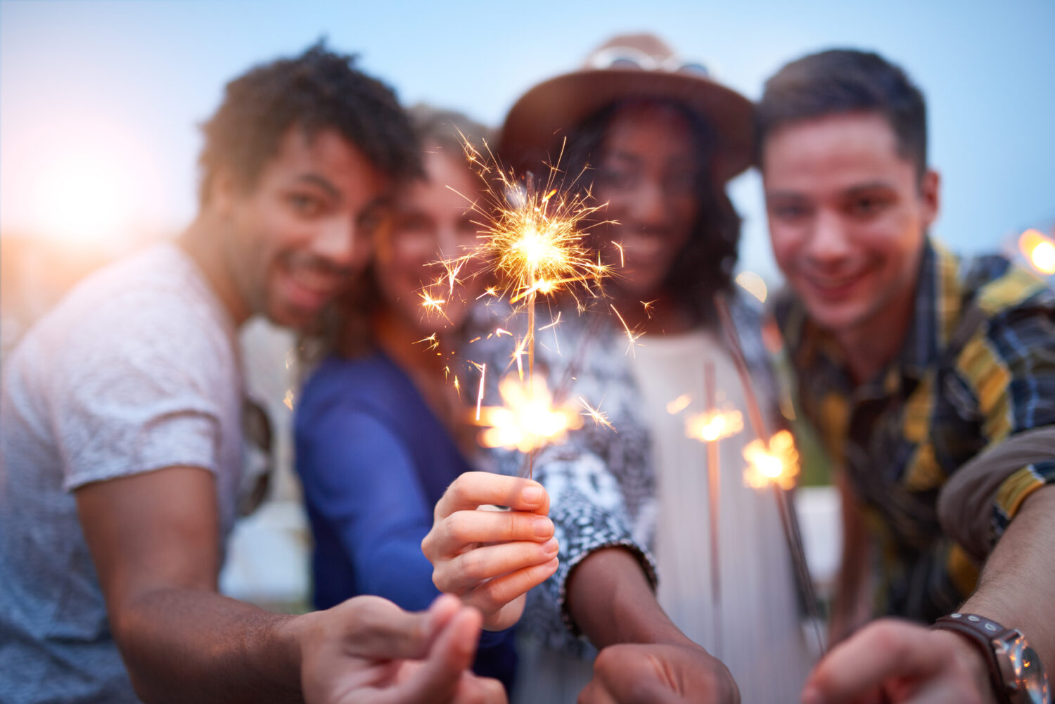 Grupo multiétnico milenario de amigos doblando chispas en la terraza de la azotea al atardecer