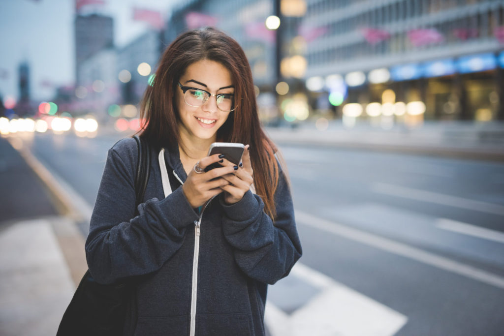 Half length of young beautiful caucasian brown hair woman with glasses tapping the screen of a smart phone hand hold in the city evening – technology, social network, communication concept