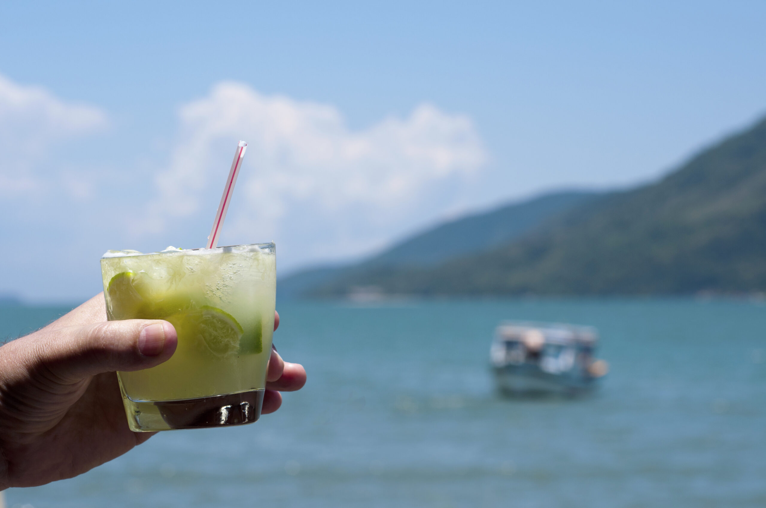 Hand holding glass of caipirinha on the beach. Paraty, Rio de Janeiro, Brazil.
