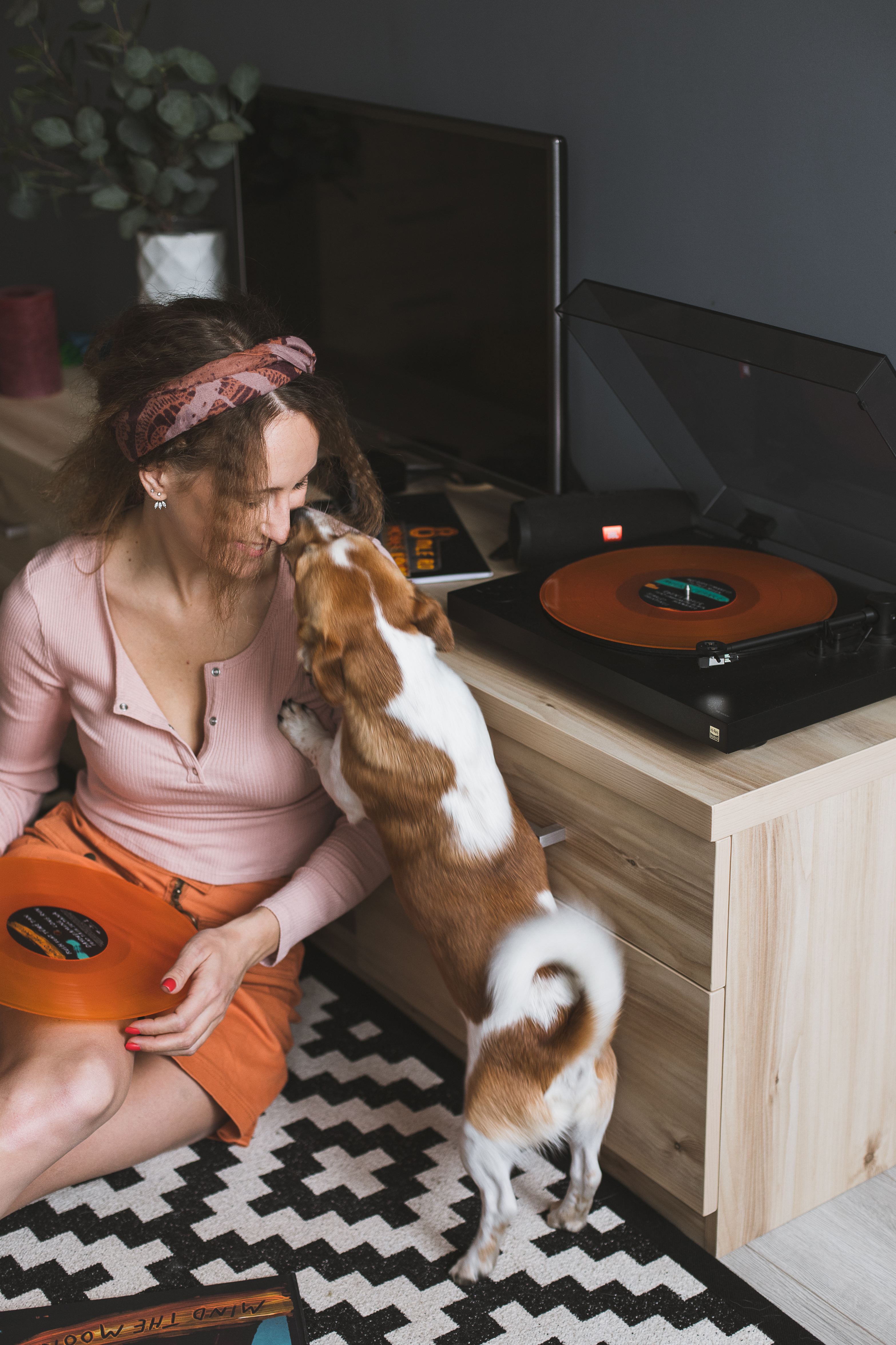 Happy attractive girl with a vinyl record in her hands having fun with her dog. A girl listens to a turntable and her dog licks her nose