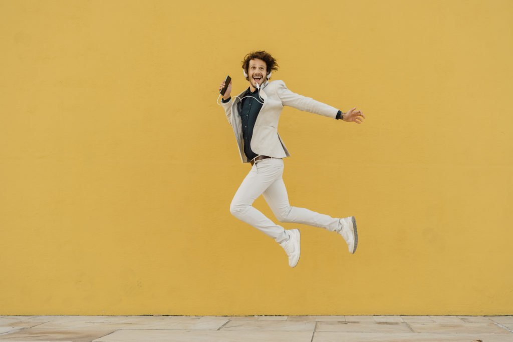 Happy businessman jumping in the air in front of yellow wall listening music with headphones