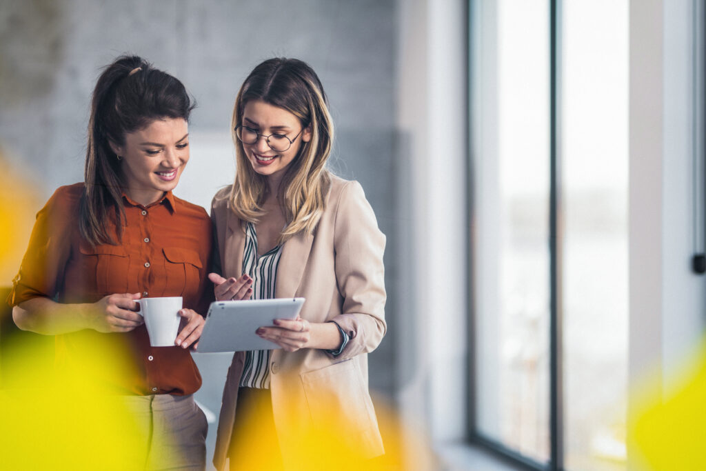 Happy businesswomen cooperating while working on touchpad.