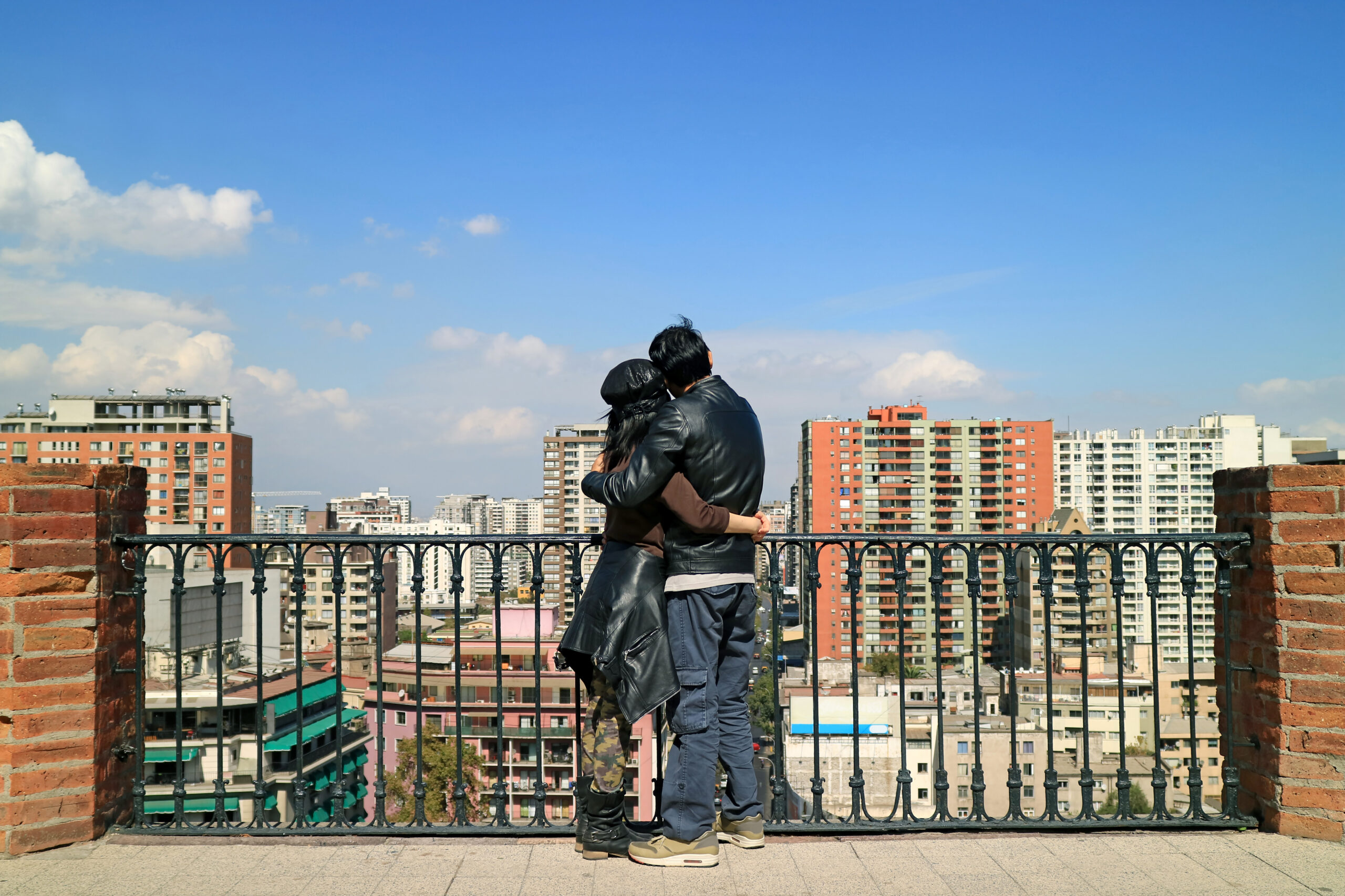 Happy Couple Embracing at the View Point of Santa Lucia Hill, Santiago, Chile, South America