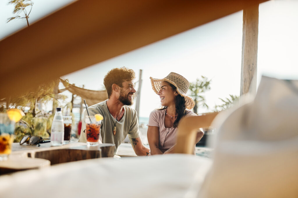 Happy couple talking while relaxing in a beach café. ID: 75060 Young happy couple communicating while spending a summer day in a beach café.