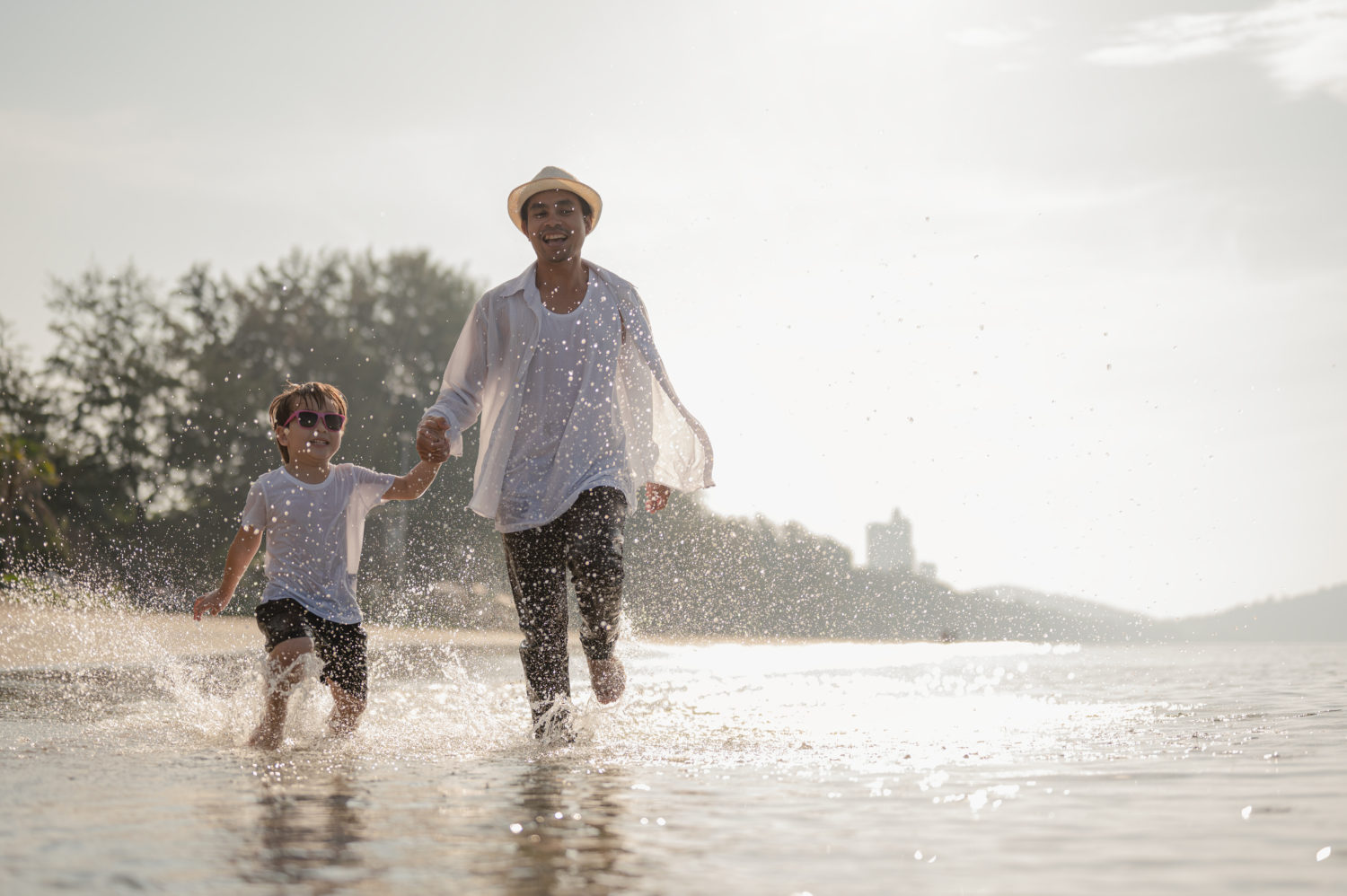happy family having fun running on beach at sunset holiday