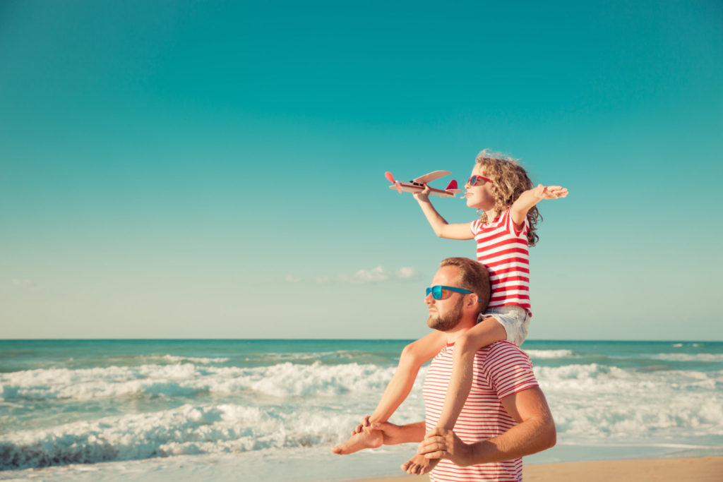 Happy family on the beach. People having fun on summer vacation. Father and child against blue sea and sky background. Holiday travel concept