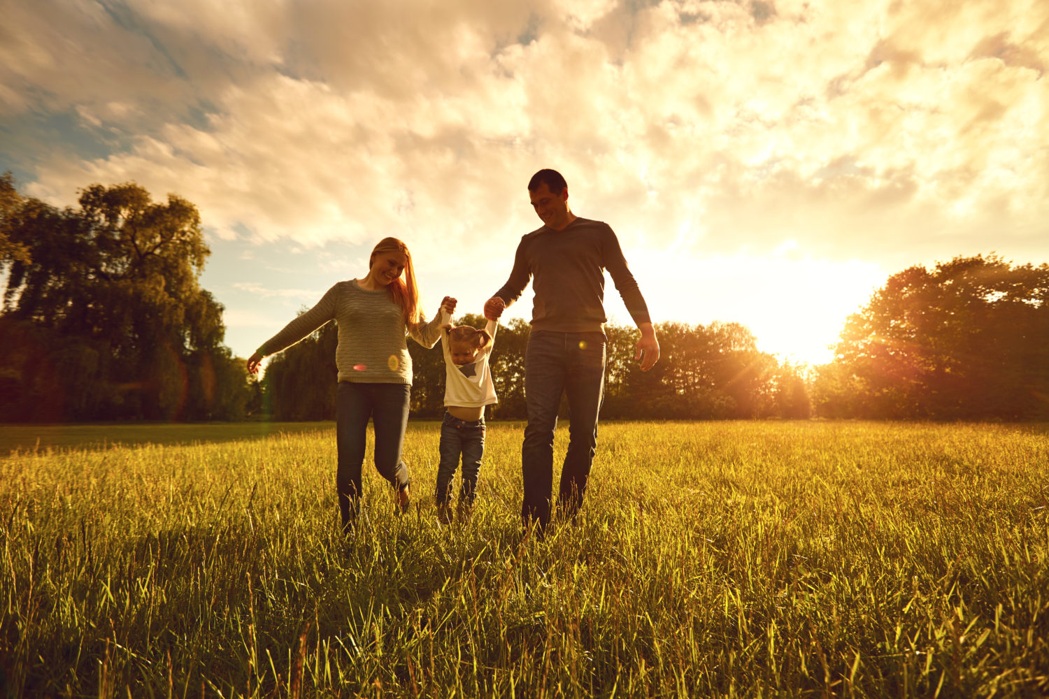 Happy family walks on the park at sunset.