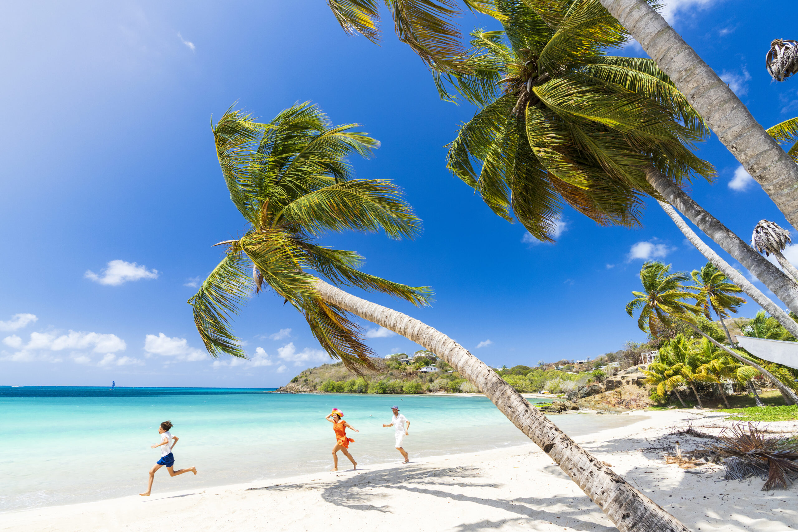 Happy little boy with family running on tropical beach, Antigua, Leeward Islands, Caribbean, West Indies
