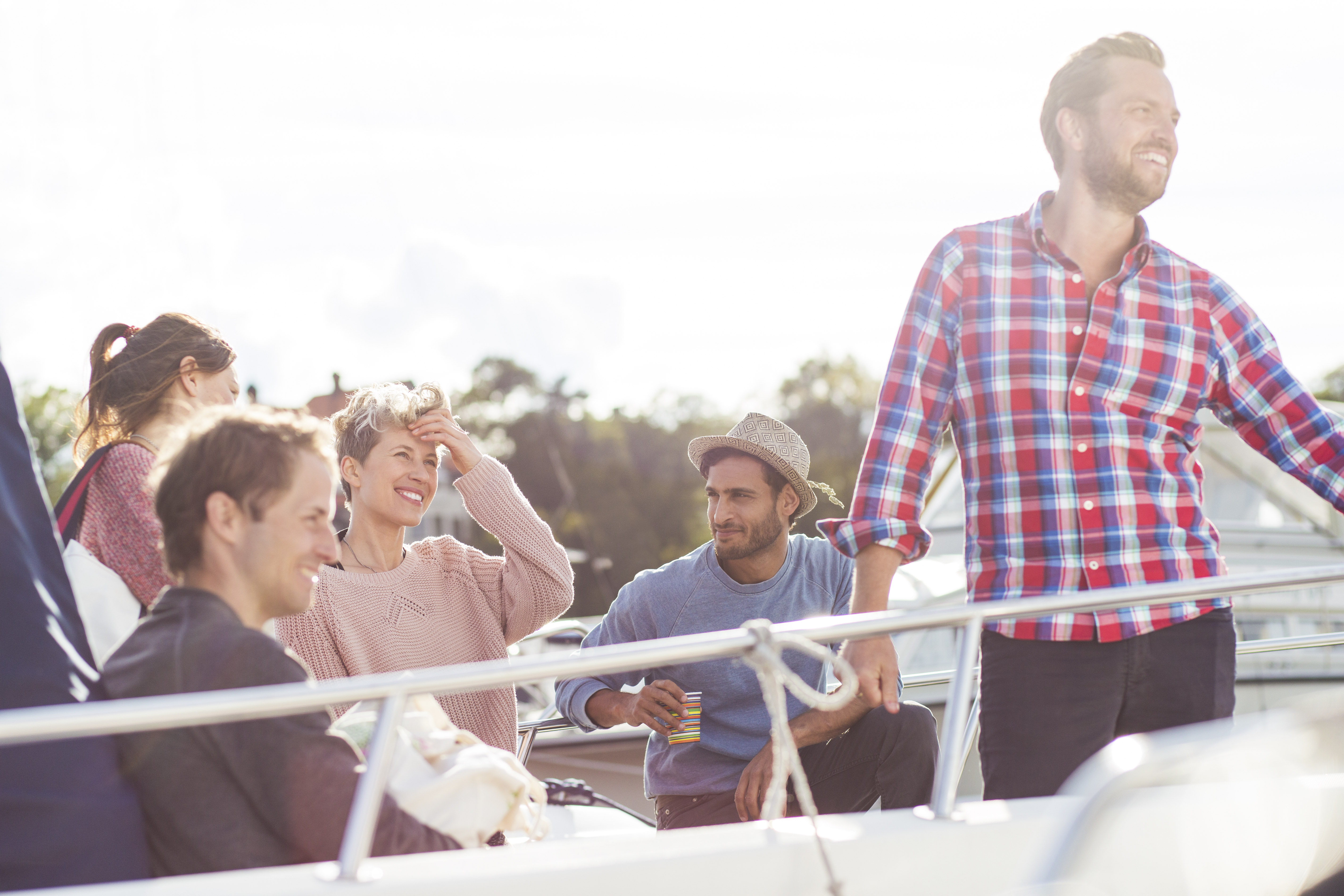 Happy friends on yacht against sky