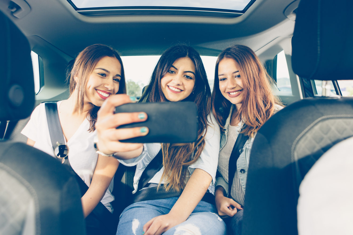 Happy group of girls friends making a selfie sitting on the back of a car on a journey