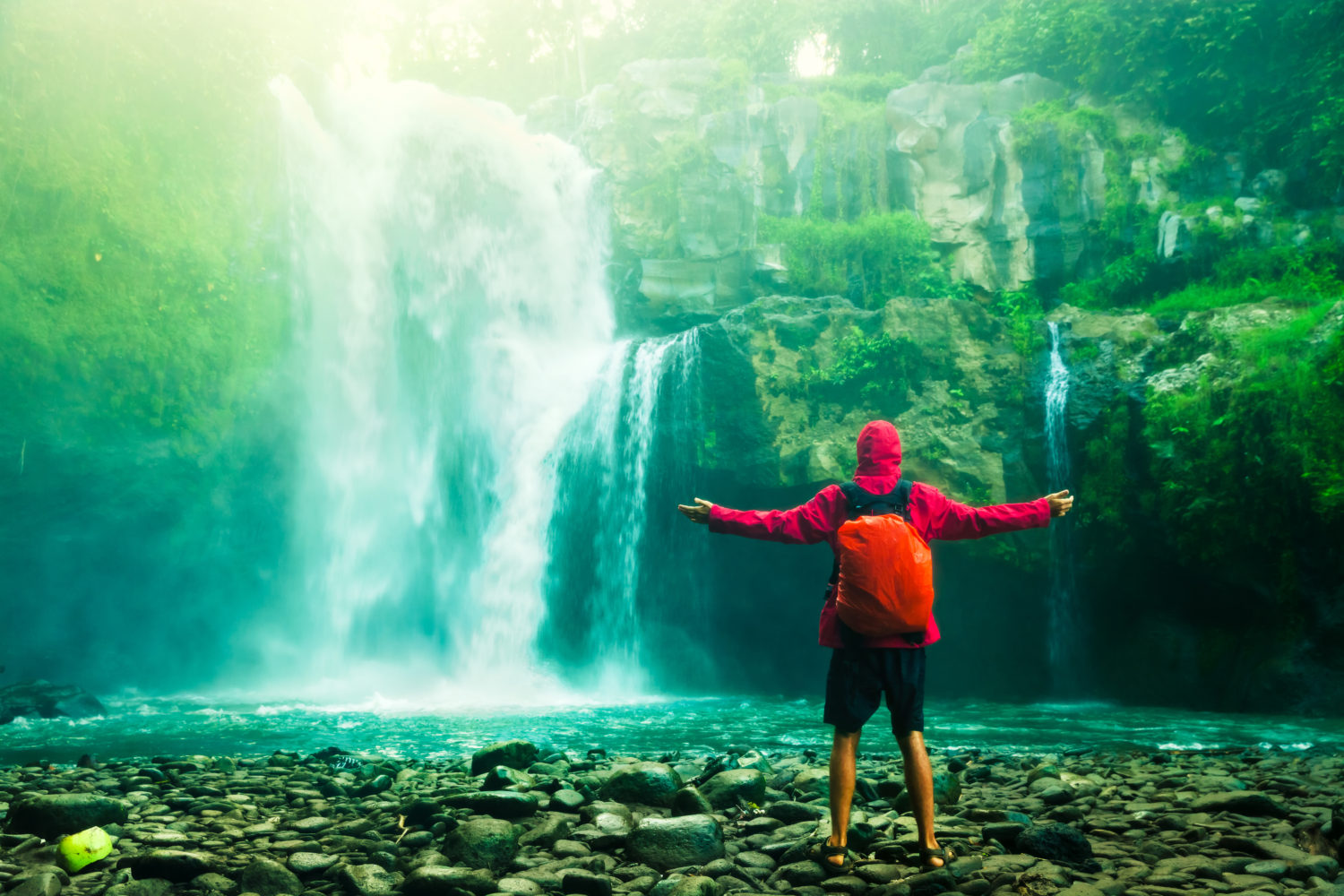 happy man backpacker enjoying amazing tropical waterfall raised hands travel