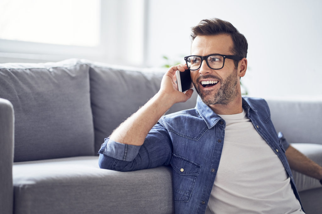 Happy man in living room talking on cell phone