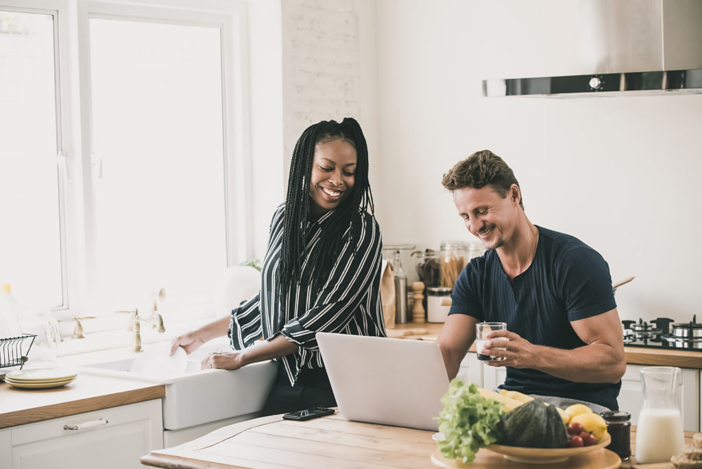 Happy married interracial couple looking at laptop computer together while doing daily moring routines in the kitchen at home