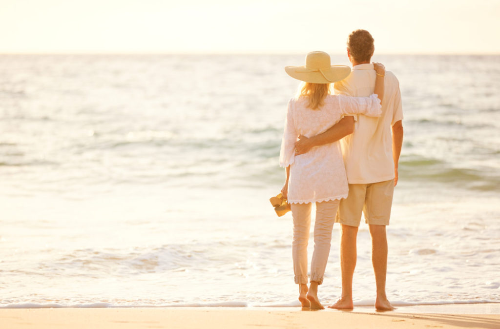 happy romantic middle aged couple enjoying beautiful sunset walk on