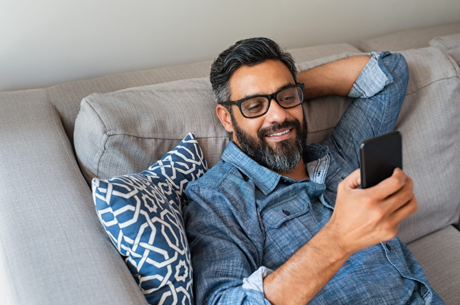 Happy smiling latin man using smartphone device while sitting on sofa at home. Mature indian man lying on couch reading messages on mobile phone. Hispanic guy with eyeglasses relaxing at home.