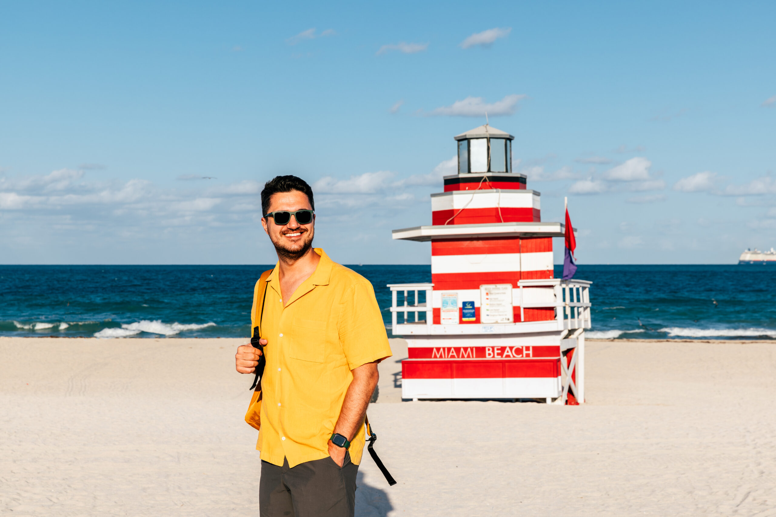 Happy smiling man in a yellow shirt at South Beach, Miami, USA
