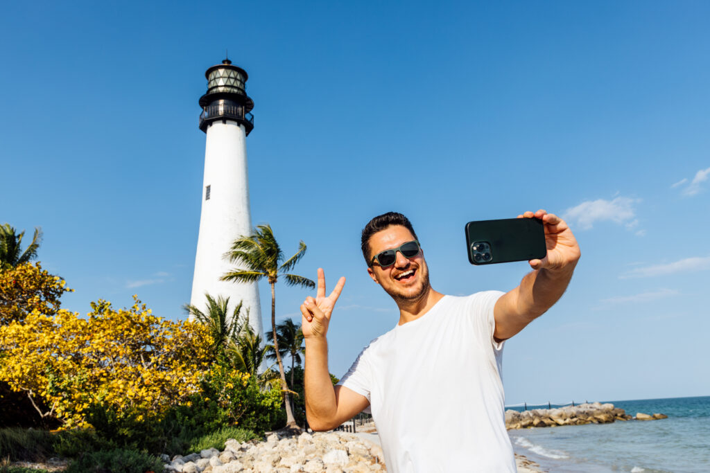 Happy smiling man taking a selfie using smartphone with Cape Florida Light lighthouse at Bill Baggs Cape Florida State Park, Florida, USA ID: 75890 -1