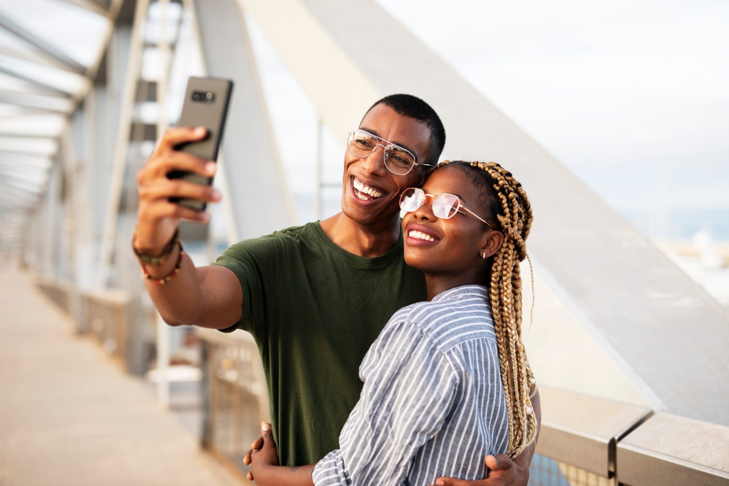 happy smilng couple taking selfie with phone outdoors boyfriend and