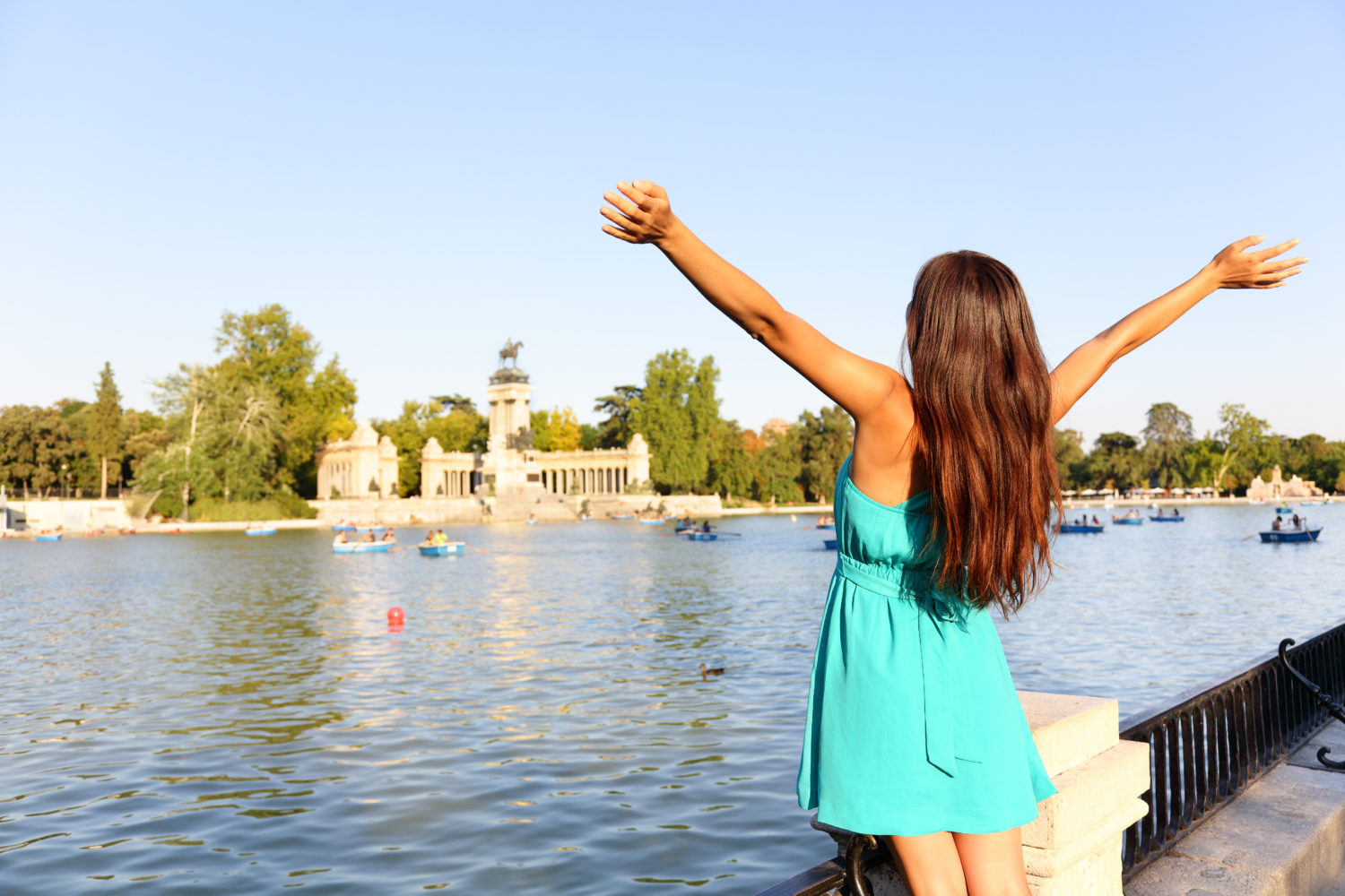 Happy success woman in Madrid park El Retiro. Successful girl cheerful with arms up outstretched in by lake Parque el Retiro in Madrid, Spain, Europe. Woman in summer dress.