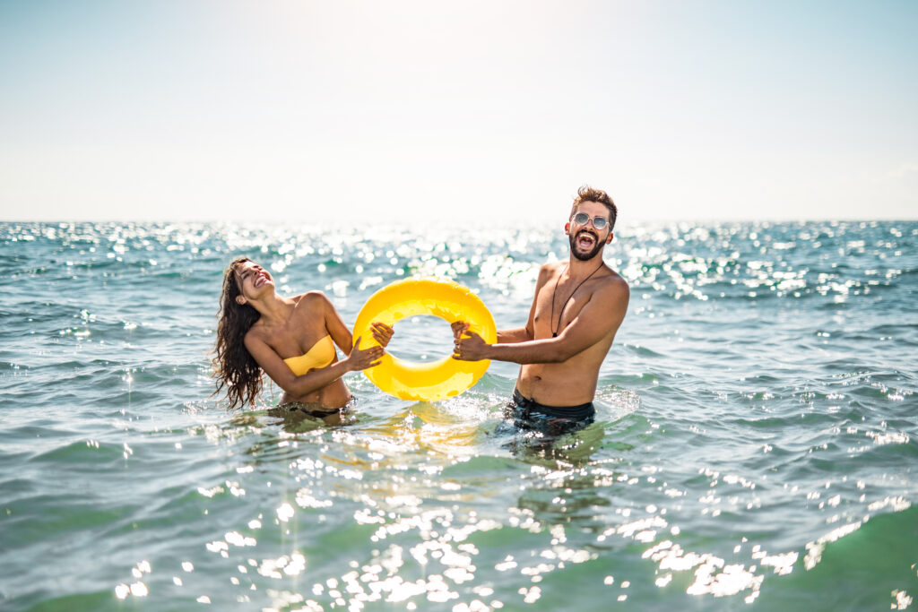 Happy young couple having fun on the beach together.
