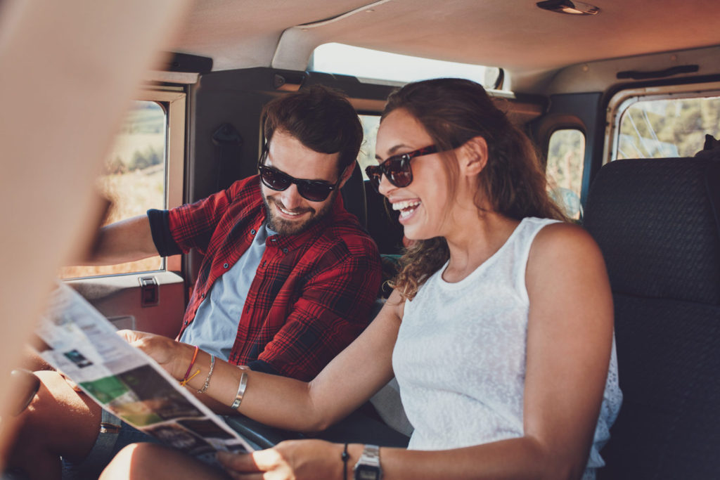 Happy young couple planning their travels together reading a map while sitting in their car. Smiling man and woman using map on roadtrip.