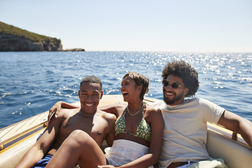 Happy young friends sitting together in motorboat ID: 69821 Happy young friends sitting together in motorboat on sea during sunny day