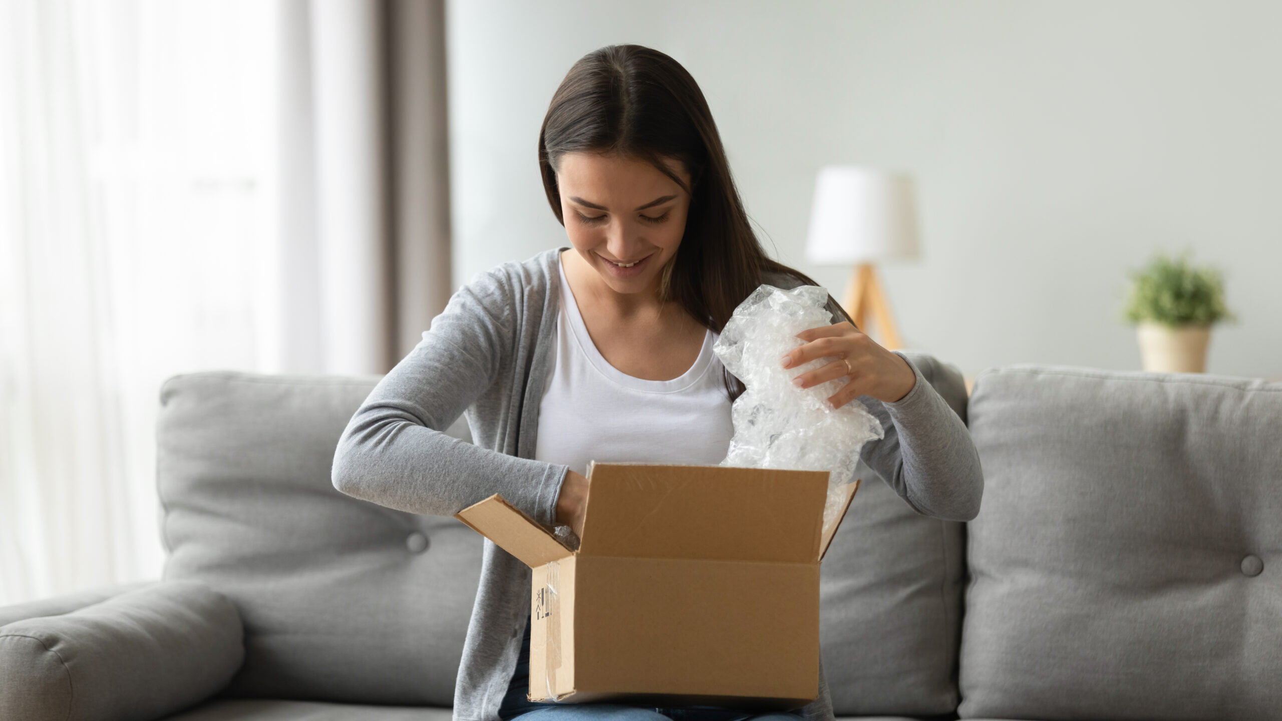Happy young pretty woman sitting on comfortable sofa, unwrapping cardboard box with ordered online goods at home. Smiling millennial pleasant girl unpacking parcel with sale internet purchase.