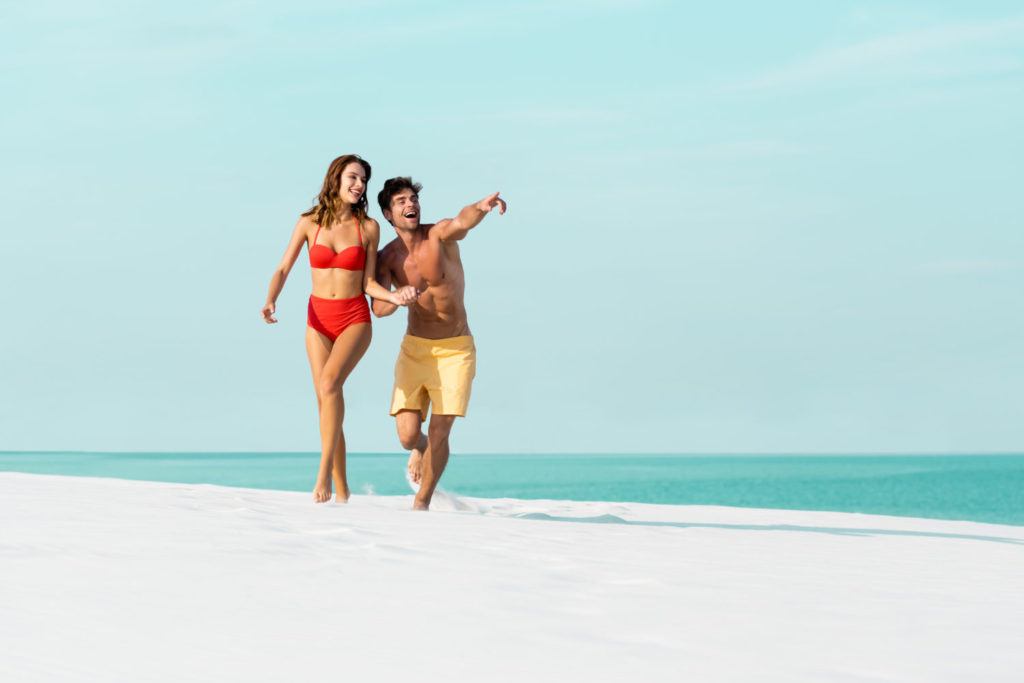 happy young sexy couple running on sandy beach and pointing