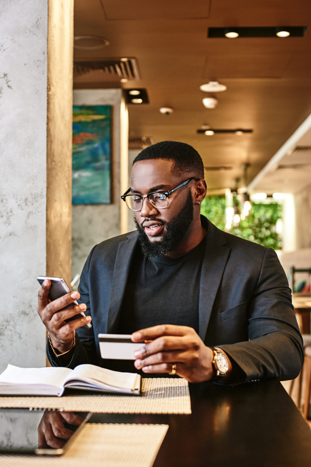 Hard work does pay off. Shot of african american businessman holding mobile and credit card, while resting in the cafe