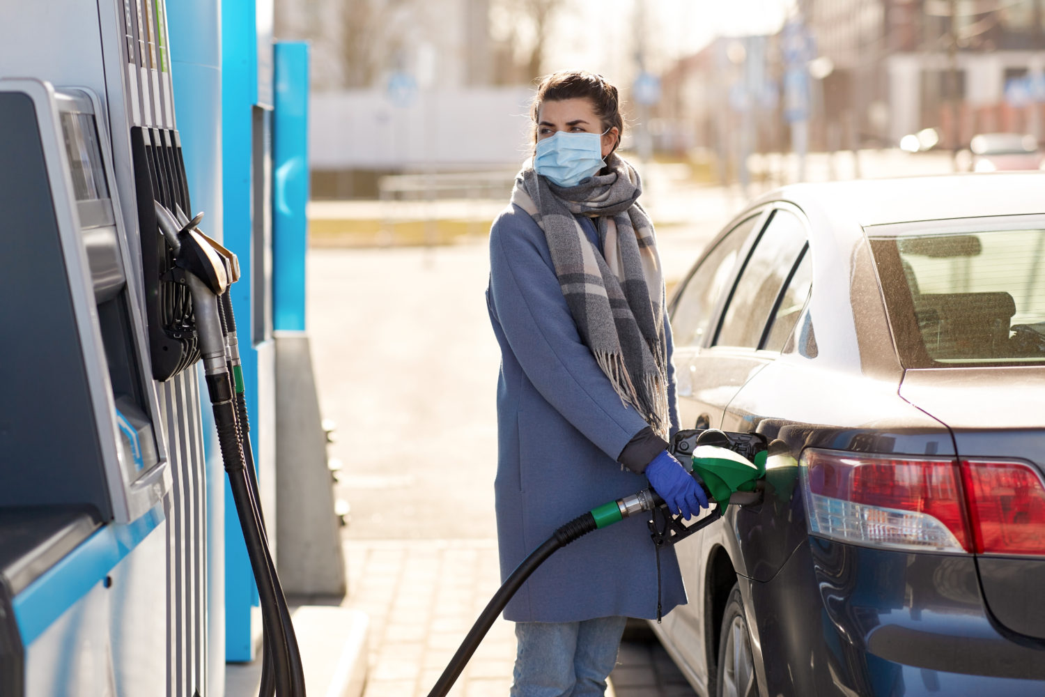 health, safety and pandemic concept – young woman wearing protective medical mask and gloves filling her car with gasoline at gas station