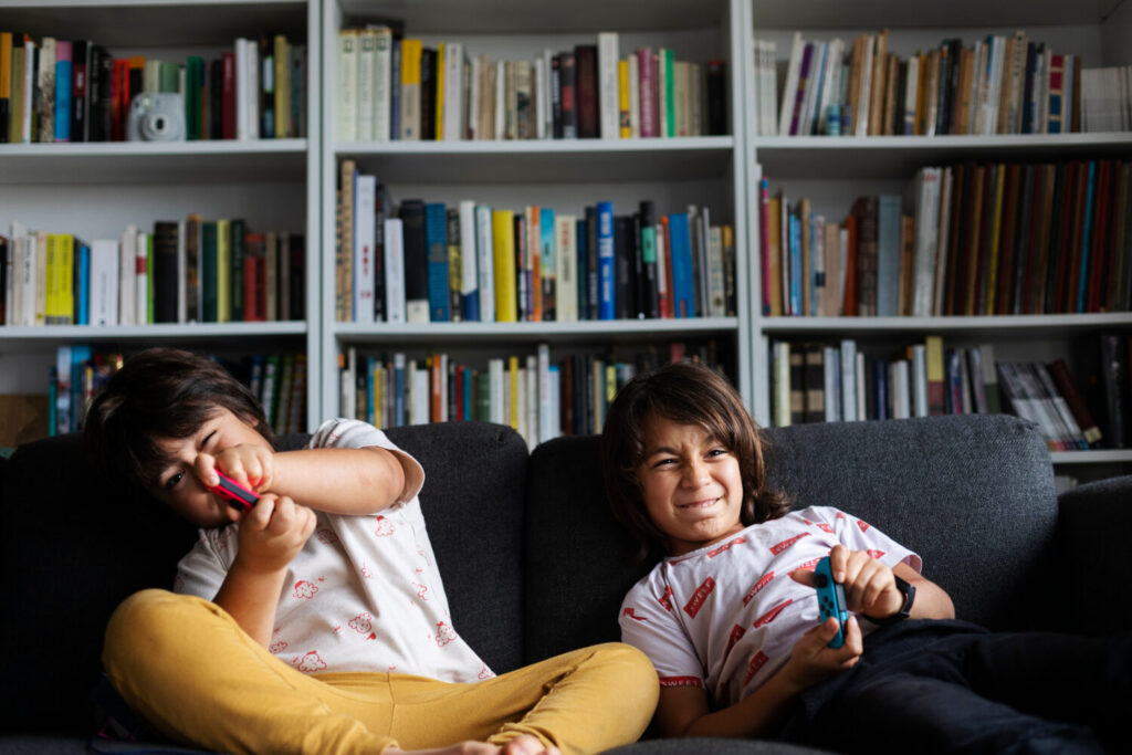 hermanos jugando a videojuegos mientras se sientan en el sofa