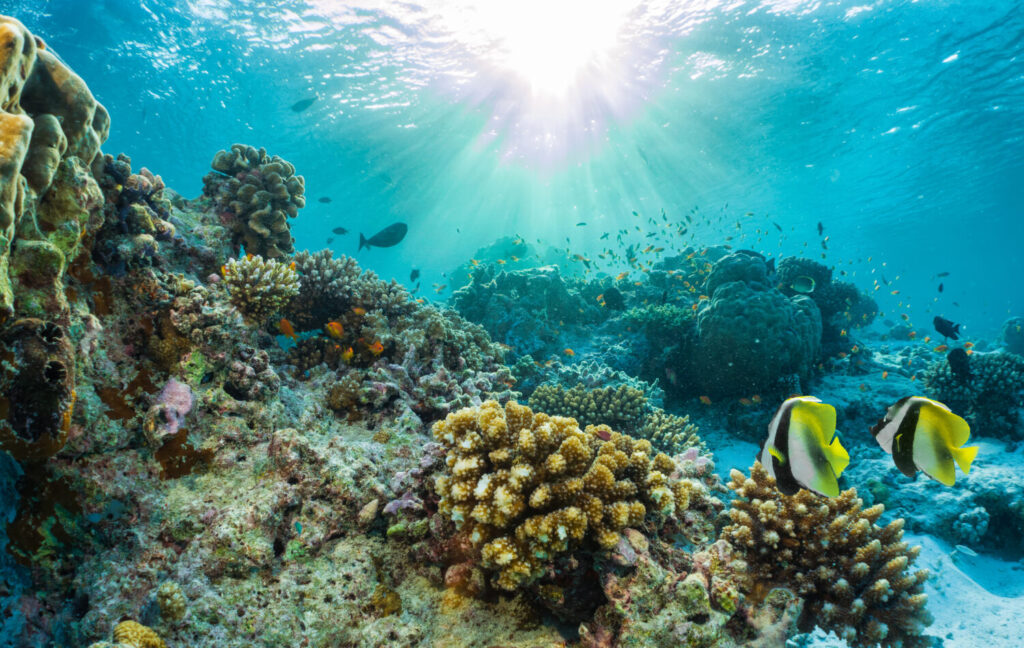 Hermosa barrera de coral submarina con peces tropicales en las Maldivas