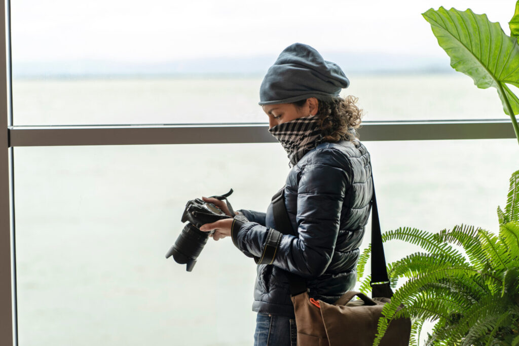 Hermosa joven fotógrafa con bandana parada cerca de una gran ventana y tomando fotos del río con cámara digital, vista lateral