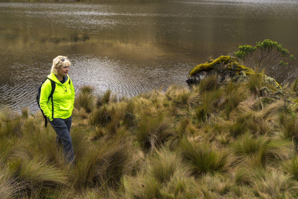 Hermosa mujer haciendo senderismo y disfrutando de la belleza de la naturaleza en el Lago en el Parque Nacional El Cajas, Ecuador